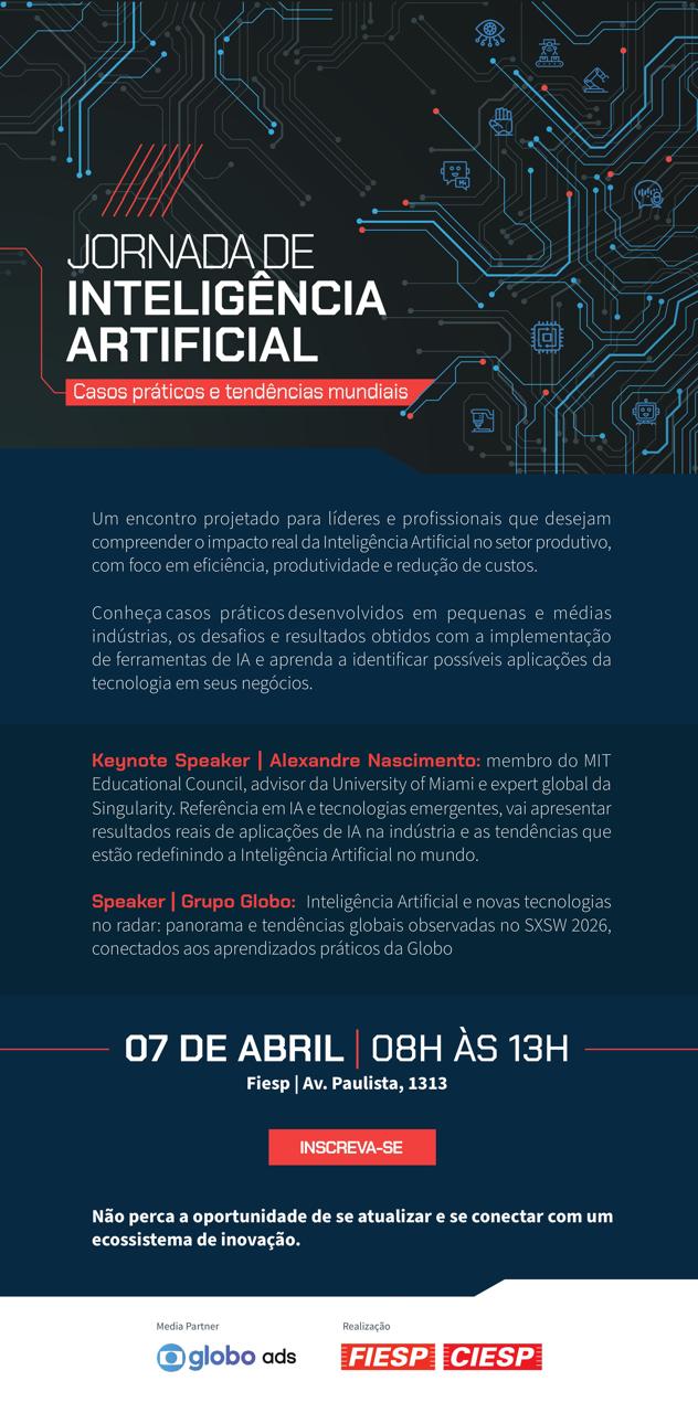A Fiesp e o Ciesp realizam, no dia 7 de abril, das 8h30 às 13h, a Jornada de Inteligência Artificial. O evento abordará casos práticos desenvolvidos por pequenas e médias indústrias, desafios, aprendizados e resultados obtidos com a aplicação de soluções de IA em seus processos. A programação inclui apresentações de especialistas e um debate sobre tendências globais, com destaque para o fato de como a Inteligência Artificial está transformando os modelos de negócios e impulsionando a competitividade industrial.