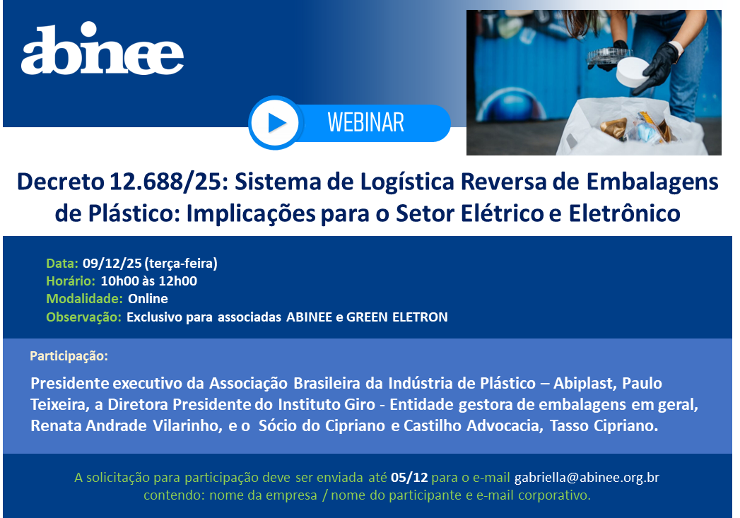A área de Sustentabilidade da Abinee realiza, no dia 9 de dezembro, o webinar “Decreto 12.688/25: Sistema de Logística Reversa de Embalagens de Plástico: Implicações para o Setor Elétrico e Eletrônico”.