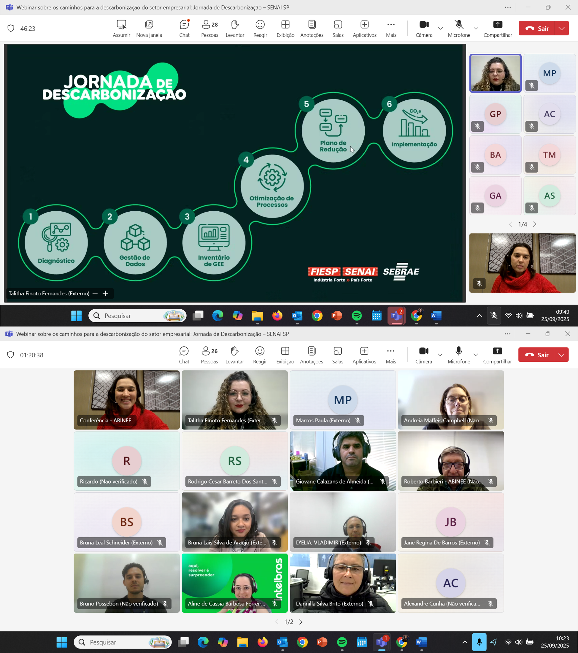 O Departamento de Sustentabilidade da Abinee realizou, no dia 25 de setembro, o Webinar sobre os Caminhos para a descarbonização do setor empresarial: Jornada de Descarbonização – Senai – SP, exclusivo para as associadas Abinee.