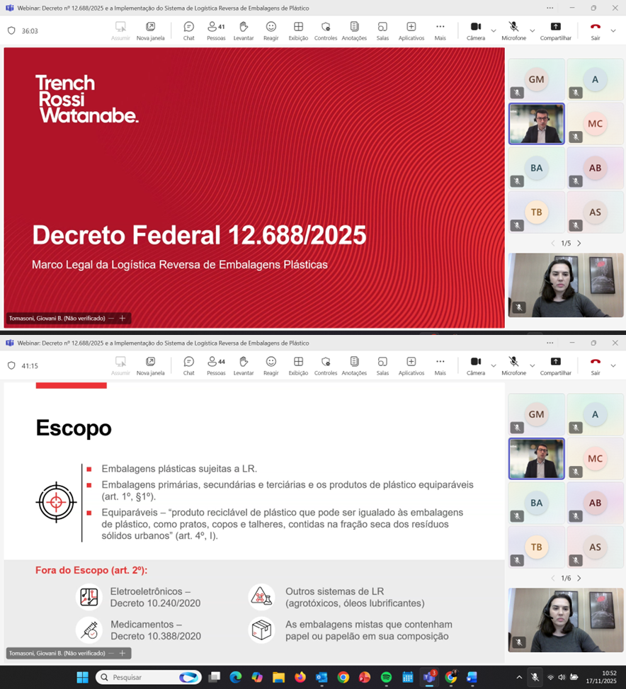O Departamento de Sustentabilidade da Abinee realizou, no dia 17 de novembro, o Webinar sobre o Decreto 12.688/2025 e a Implementação do Sistema de Logística Reversa de Embalagens de Plástico, exclusivo para as associadas Abinee e da Green Eletron, entidade gestora de produtos eletroeletrônicos e pilhas e baterias portáteis.